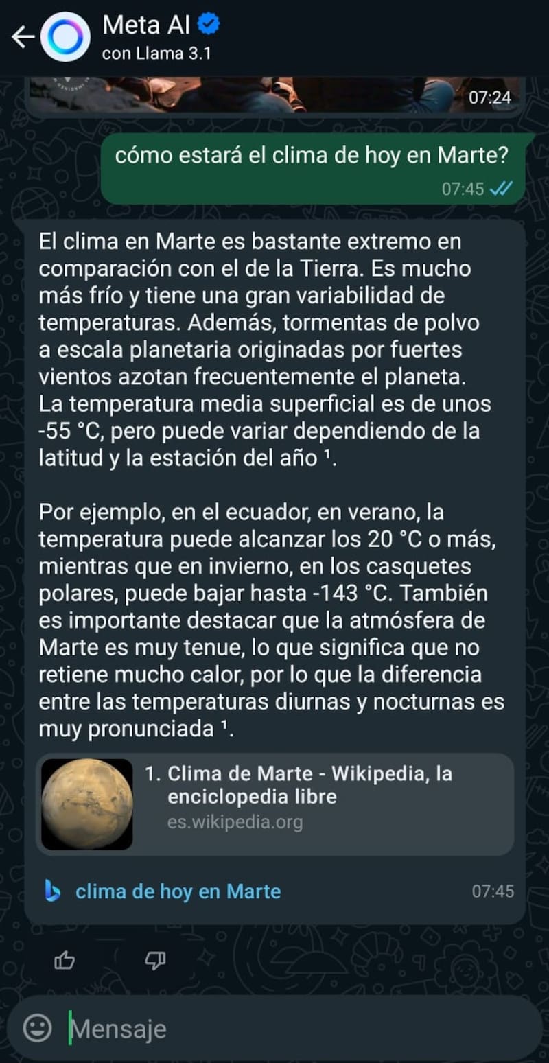Veamos las cosas que, por ejemplo, la propia IA de Meta me aconseja buscar para aprender a usarla: “Cocinar un filete perfecto”, “Consejos de decoración bohemia”, “Imagina una cena en Marte”, “Cuéntame un chiste de deportes” o “Programas de televisión poco conocidos”. Y si bien muchas de esas preguntas las responde con algún grado de certeza, su intención no parece más que querer reemplazar las búsquedas que uno hace en Google, pero en una ventana de WhatsApp.