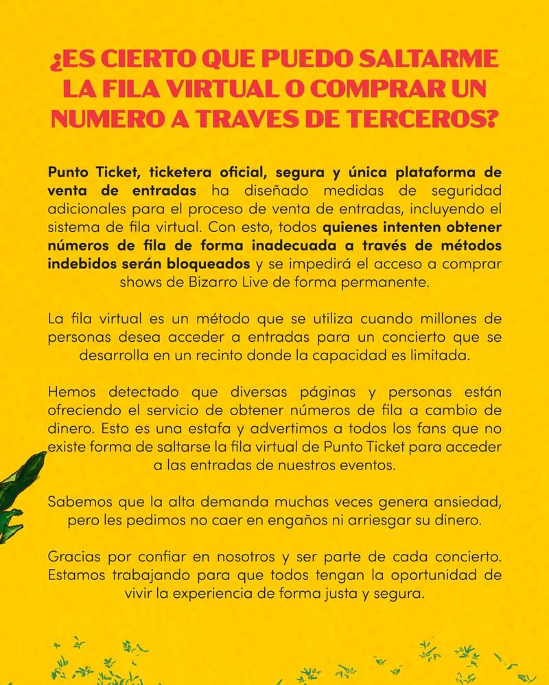 Se asegura que “quienes intenten obtener números de fila de forma inadecuada a través de métodos indebidos serán bloqueados y se impedirá el acceso a comprar shows de Bizarro Live (la productora) de forma permanente”.