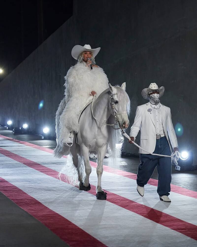 Beyoncé hizo su triunfal entrada al show montando un caballo blanco mientras comenzaba a cantar 16 Carriages. Lucía un sombrero vaquero, un vestido de plumas blanco y una banda de colores blanco, negro y azul que decía Cowboy Carter.