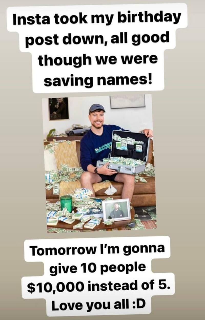Su publicación se hizo altamente viral en solo unos días. Con el motivo de celebrar su cumpleaños número 25, el youtuber MrBeast hizo este domingo un post en su cuenta de Instagram, en el que aseguró que sortearía cinco premios de $10.000 dólares —cerca de 8 millones de pesos chilenos— entre los seguidores que lo replicaran en sus historias y etiquetaran a sus amigos en la sección de comentarios.