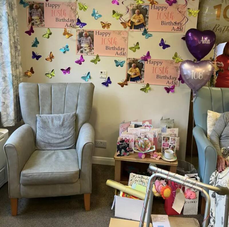 Además de ese gesto de cariño de tantos desconocidos, Goucher y el equipo del hogar quisieron celebrar a la mujer aún más: decoraron el inmueble con globos, carteles y mariposas de papel brillante. También tomaron el té.