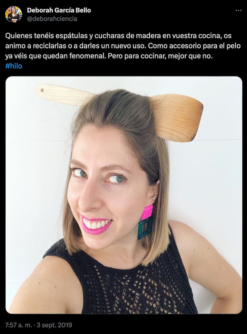 “Quienes tienen espátulas y cucharas de madera en su cocina, los animo a reciclarlas o a darles un nuevo uso. Como accesorio para el pelo ya ven que quedan fenomenal. Pero para cocinar, mejor que no”, escribió en un tono irónico, junto a una fotografía en la que se le ve con uno de estos utensilios sujetando su pelo.