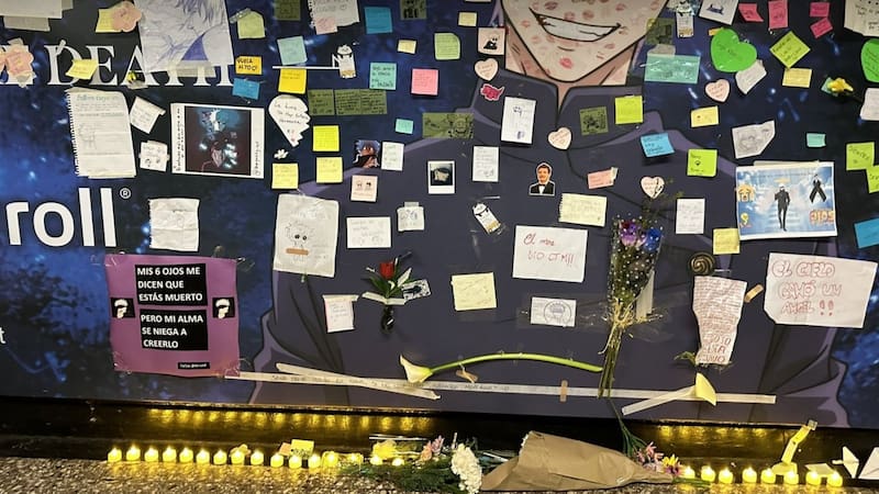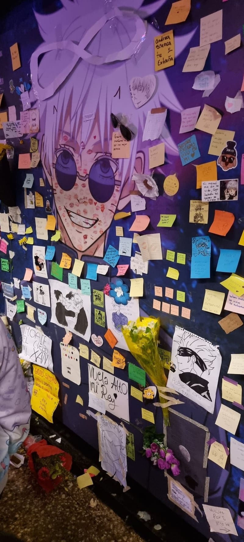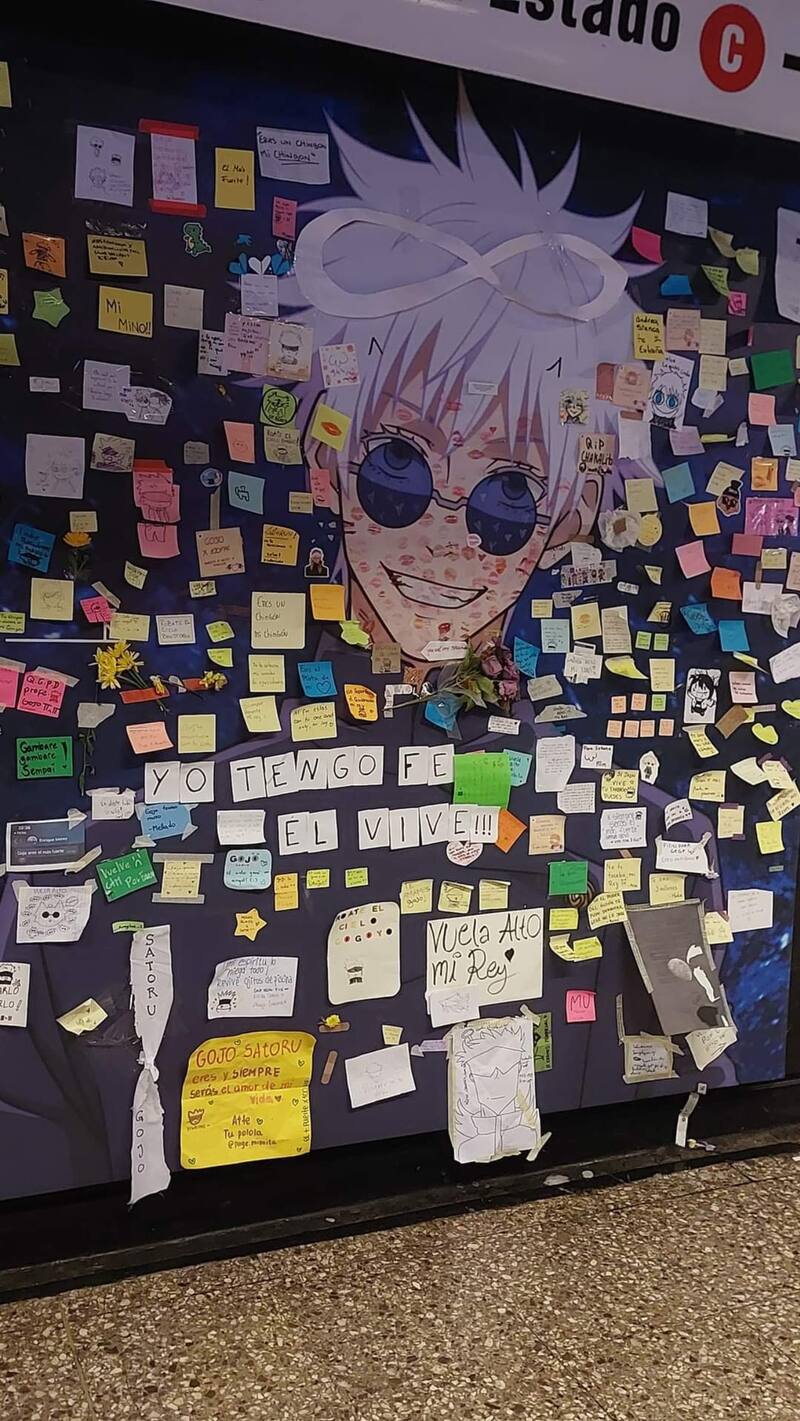 Una peculiar intervención se registró hace unos días en el Metro de Santiago: en la estación Universidad de Chile, en un muro donde yacía una gigantografía de la serie japonesa Jujutsu Kaisen, apareció una animita con flores, velas, fotografías y papeles con mensajes de condolencias.