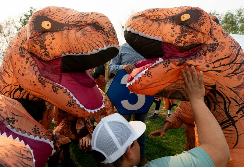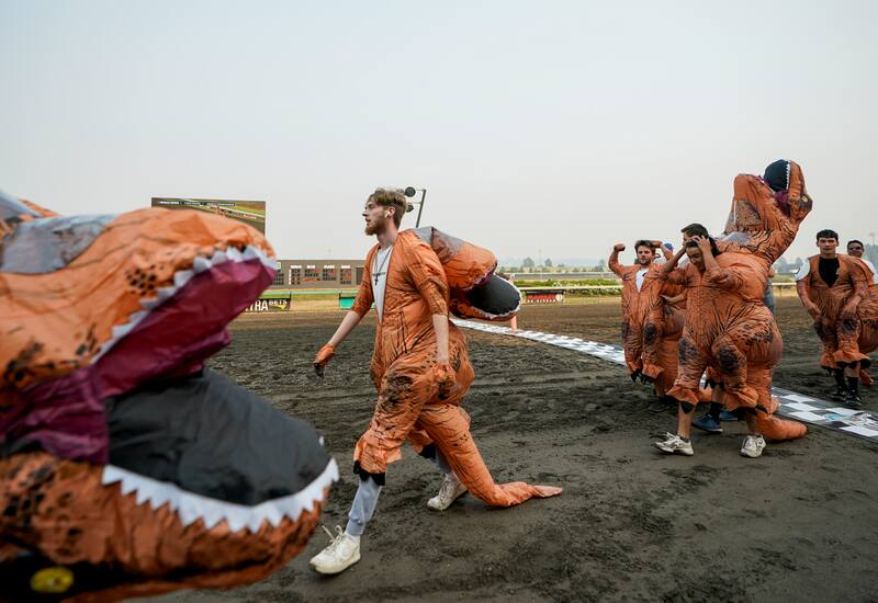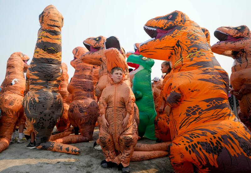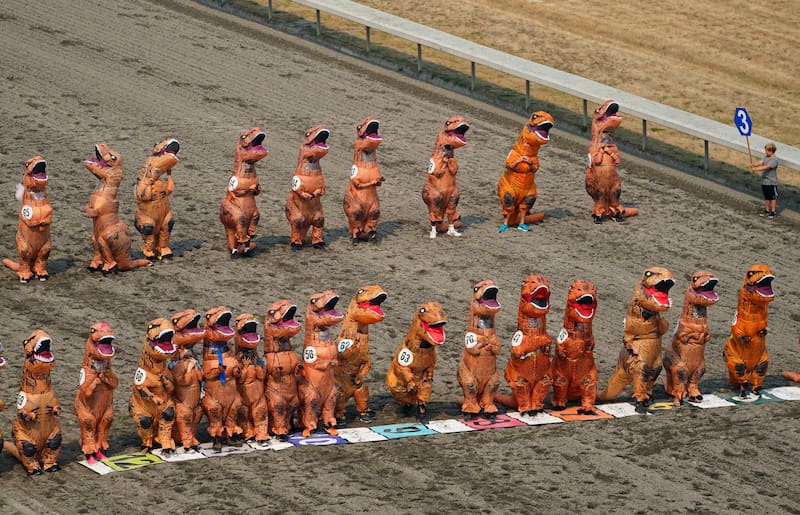 Un hipódromo de los suburbios de Seattle se convirtió en una prehistórica pista de carreras el fin de semana, cuando más de 200 personas compitieron vestidas con disfraces inflables de Tiranosaurio rex.