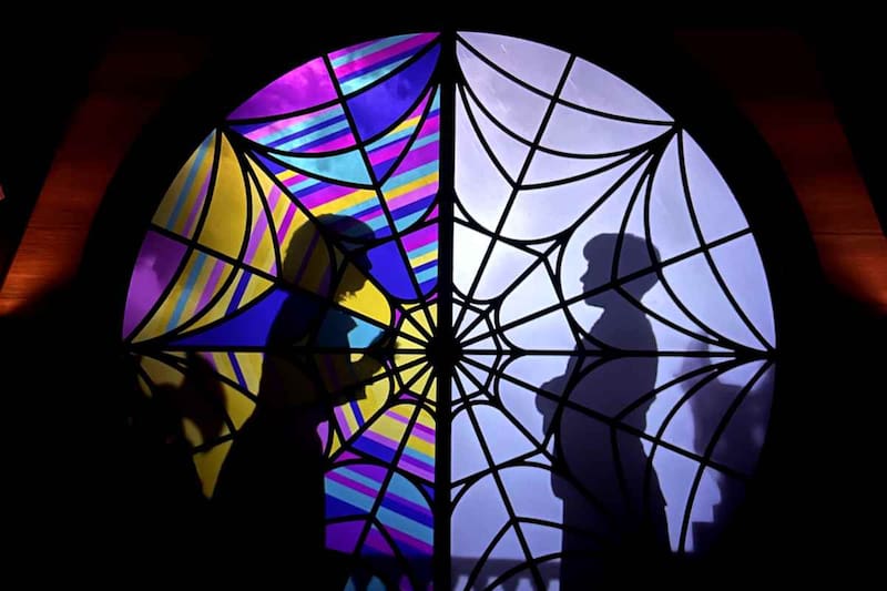 Como segunda atracción, nos adentramos en la pieza de Merlina y Enid, en Nevermore. Tal cual como en la serie, la sala está dividida en dos: el espacio rosado, lleno de peluches y alegría de Enid, y el lúgubre y gótico dormitorio de Merlina.