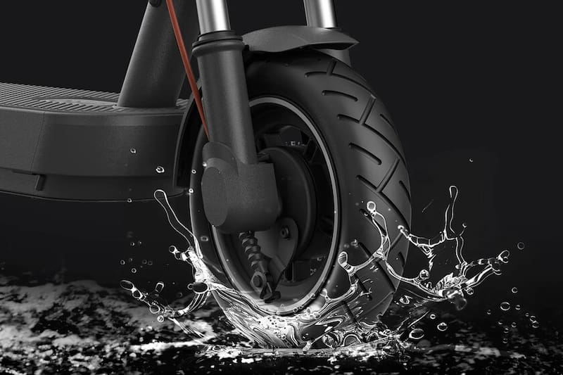 Para evitar los molestos pinchazos de ruedas, por ejemplo, el nuevo scooter de Xiaomi no solo cuenta con neumáticos de 10 pulgadas sin cámara de aire y 60 mm de ancho; las llantas están diseñadas para absorber impactos, mejorar el agarre en curvas y la estabilidad.