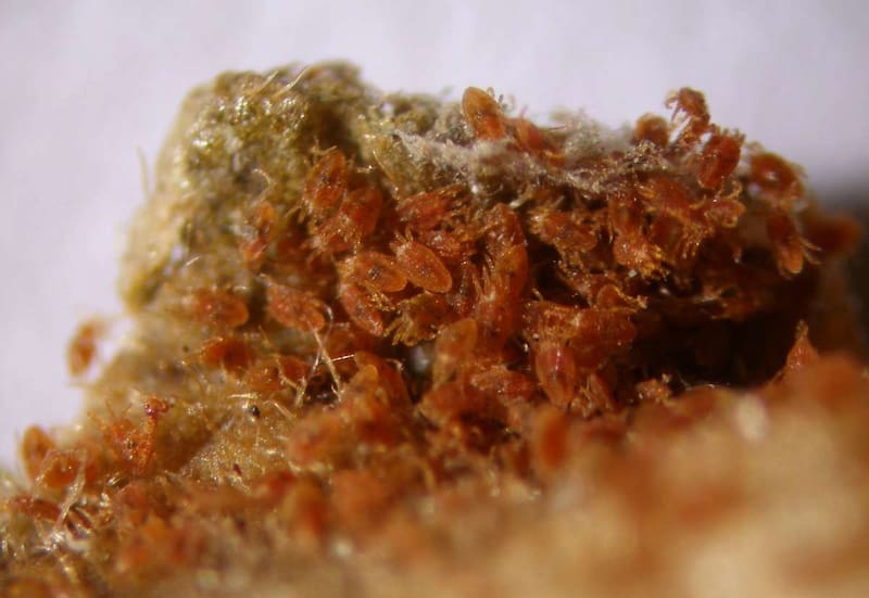 La hembra suele tener el cuerpo ovalado y plano, y es de color rojo oscuro con manchitas negras. Mide menos de 1 milímetro. En cambio, el macho es más pequeño y su cuerpo es triangular.