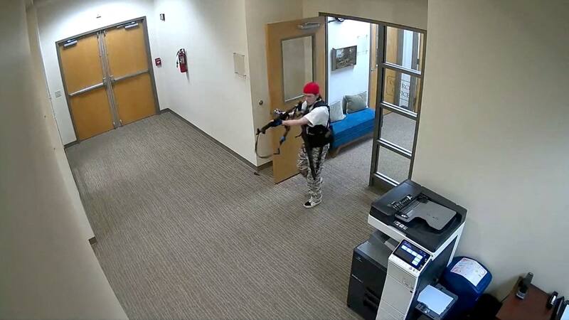 El reloj marca las 10:11 de la mañana cuando Hale ingresa al colegio y se ubica bajo la cámara de seguridad, apuntando con un rifle semiautomático.