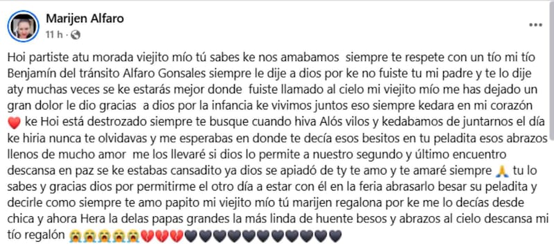 “Descansa en paz. Sé que estabas cansadito, ya Dios se apiadó de ti (...) Sé que estarás mejor donde fuiste llamado al cielo, mi viejito mío. Me has dejado un gran dolor. Te amo y te amaré siempre (...) Besos y abrazos al cielo. Descansa mi tío regalón”.