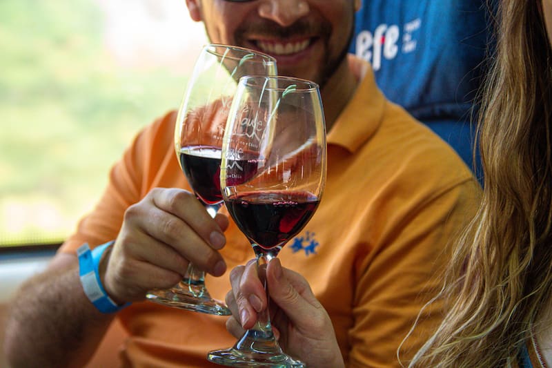 Durante el trayecto se realizan degustaciones a bordo y, una vez en destino, los pasajeros visitan bodegas, conocen el proceso de producción y fermentación del vino y comparten un almuerzo en la viña seleccionada.