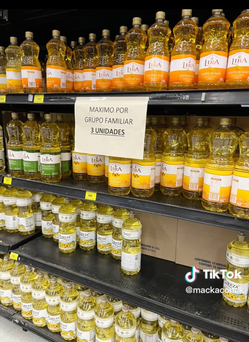 Entre las múltiples imágenes que mostró —como los diferentes tipos de dulces que no están en Chile— , la que más llamó la atención de los cibernautas es que se ven carteles en los supermercados que dicen “máximo por grupo familiar: 3 unidades”. Aquello se leía tanto junto a las muestras de aceite como a las de ciertas bebidas de cola.