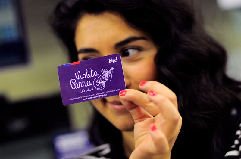 En 2017, en el país se celebraron los 100 años de nacimiento de la artista chilena Violeta Parra. El Metro de Santiago no se quedó atrás, y lanzó la Bip! conmemorativa, con un diseño que incluyó la caligrafía que la artista bordó para “Afiche” y un detalle de la obra “Thiago de Mello”.