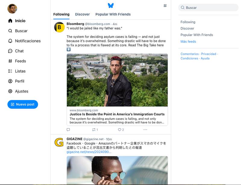 Como observamos en la imagen, Bluesky ostenta una apariencia muy similar a como era el Twitter de antaño, con sus colores y distribución de botones. Asimismo, permite dar me gusta, repostear, citar, enviar mensajes privados, crear listas. Eso hace mucho más amigable para un “ex tuitero” la de llegar a un servicio más que parecido.
