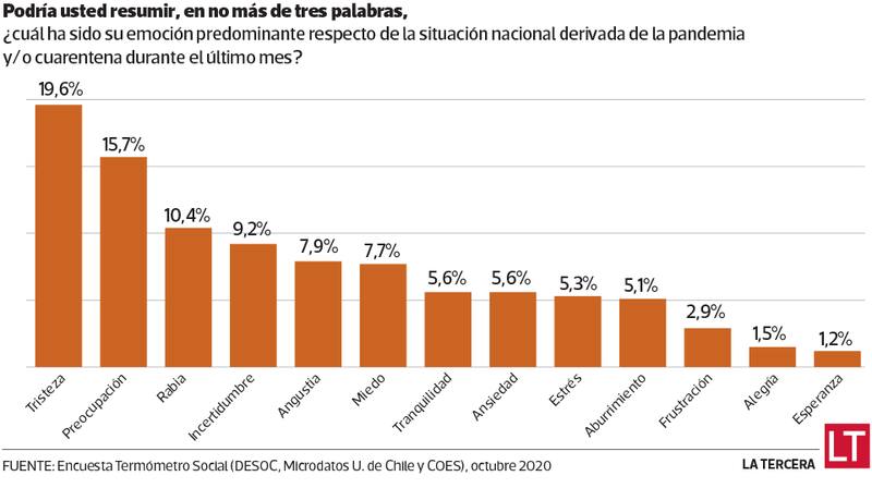 La encuesta longitudinal “Termómetro Social” -elaborada por el Núcleo Milenio en Desarrollo Social (Desoc), Centro de Microdatos de la Universidad de Chile y el Centro de Estudios de Conflicto y Cohesión Social (Coes)- nació después del estallido social y tuvo sus dos primeras versiones en noviembre y diciembre de 2019. En junio y octubre de este año recopiló su tercera y cuarta muestra que midieron precisamente un aspecto que hoy es clave: las emociones reportadas por los chilenos en plena pandemia.