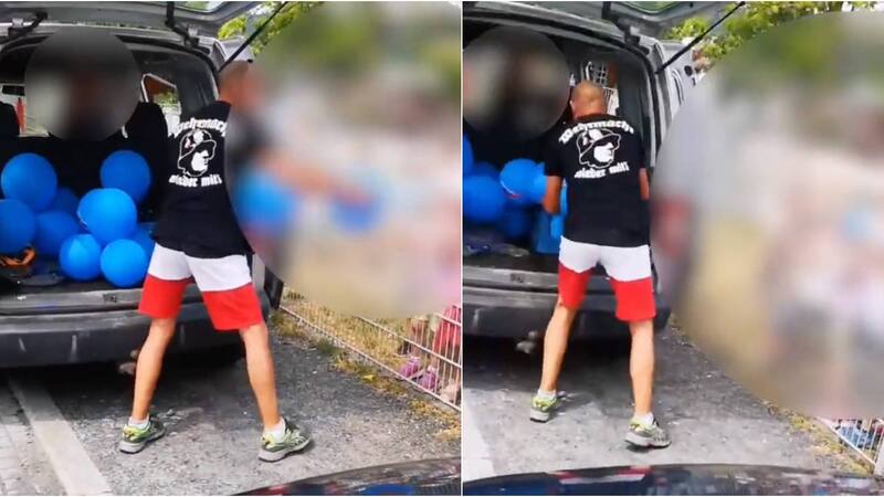 El hombre viste también shorts rojos, blancos y negros —colores asociados al régimen nazi— mientras saca globos azules de su automóvil y los reparte entre la multitud entusiasta de niños al otro lado de una cerca.
