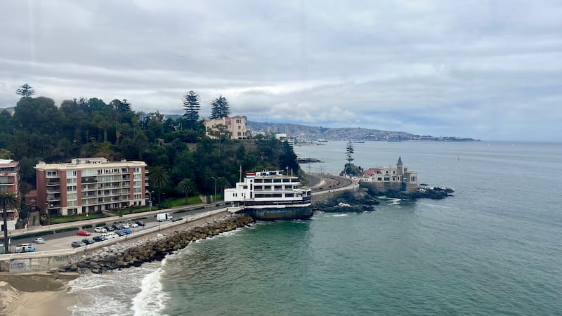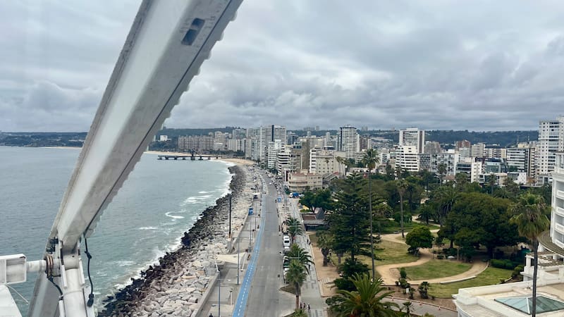 La Gran Rueda permite ver hacia el sur íconos como el Castillo Wulff, el restaurante Cap Ducal, la desembocadura del Estero Marga Marga y el palacio presidencial Cerro Castillo.