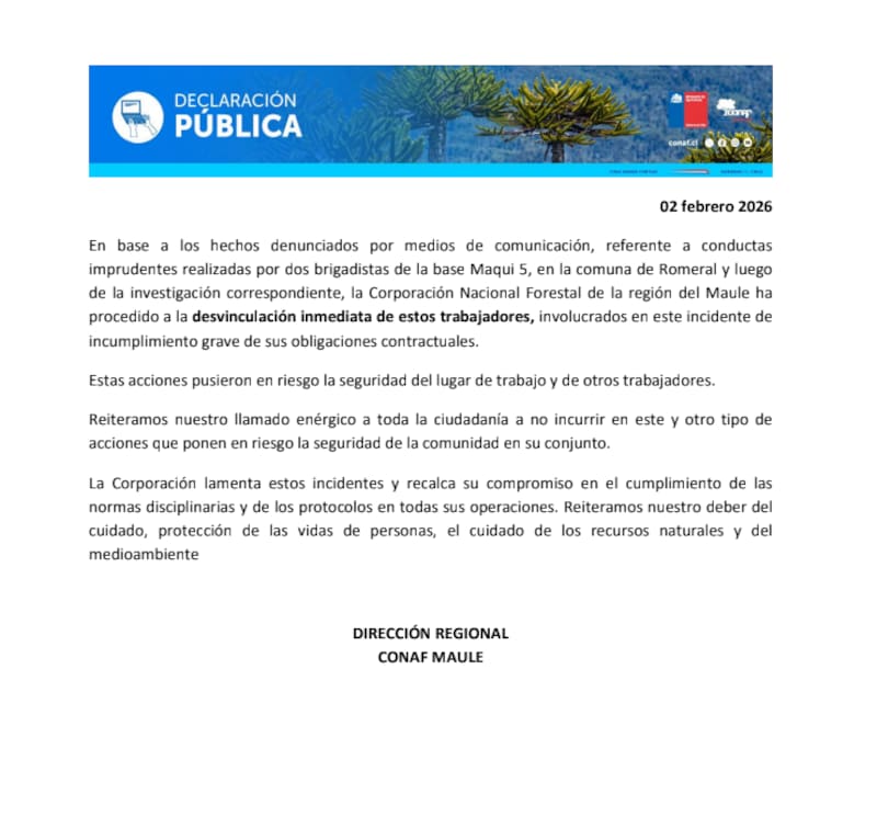 El informe precisó que las acciones pusieron en riesgo el lugar de trabajo y la integridad de otros funcionarios presentes, donde condenaron los hechos y recalcaron su compromiso de las normas disciplinarias y los protocolos de seguridad que rigen en la Conaf.