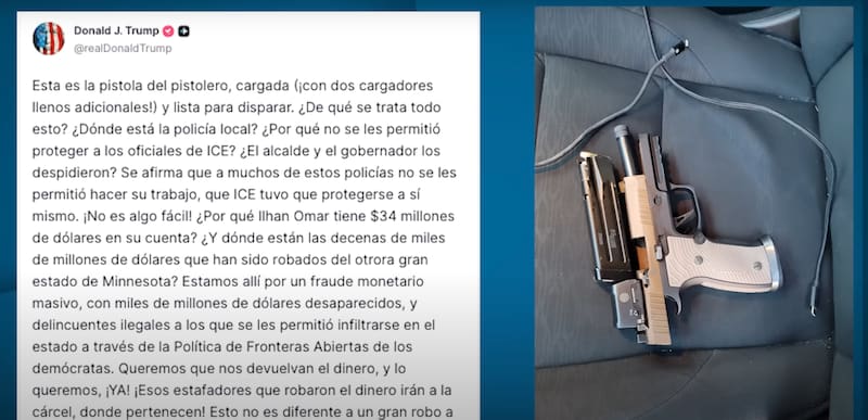 Pese a las claras evidencias que muestran los registros, y sin esperar resoluciones de la investigación, el mandatario de EE.UU., Donald Trump, tildó a Pretti en un posteo en su red social Truth, como un “pistolero”, publicación que acompañó de una foto del arma 9 milímetros que se le incautó al enfermero tras su muerte.